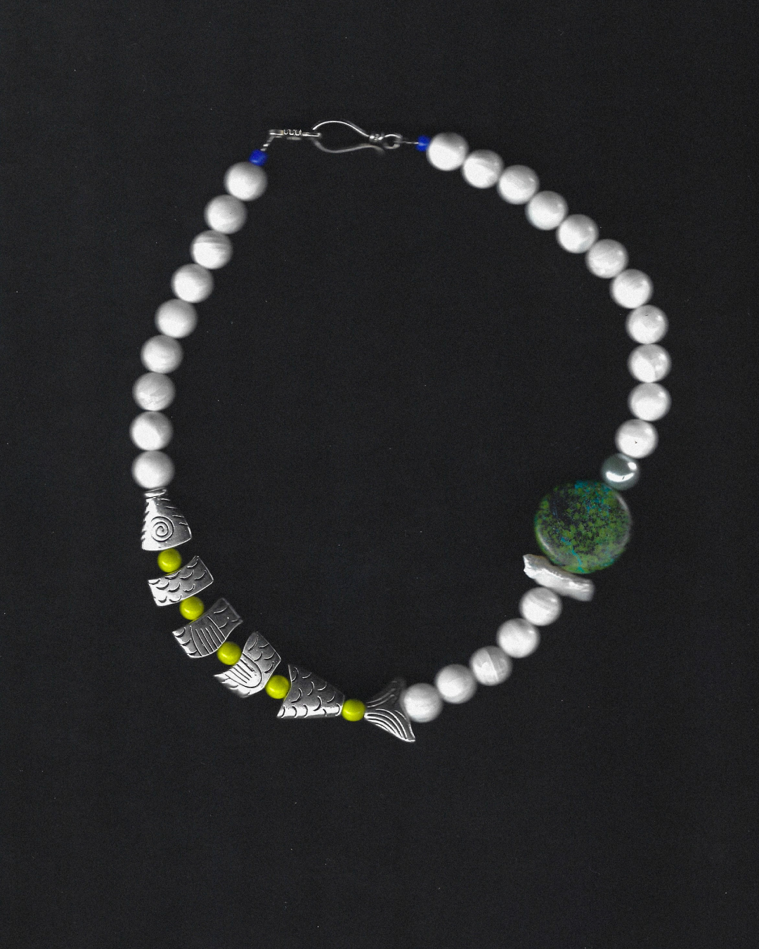 - Made with upcycled stone and pearl beads, and newly sourced white stone and segmented fish-shaped beads