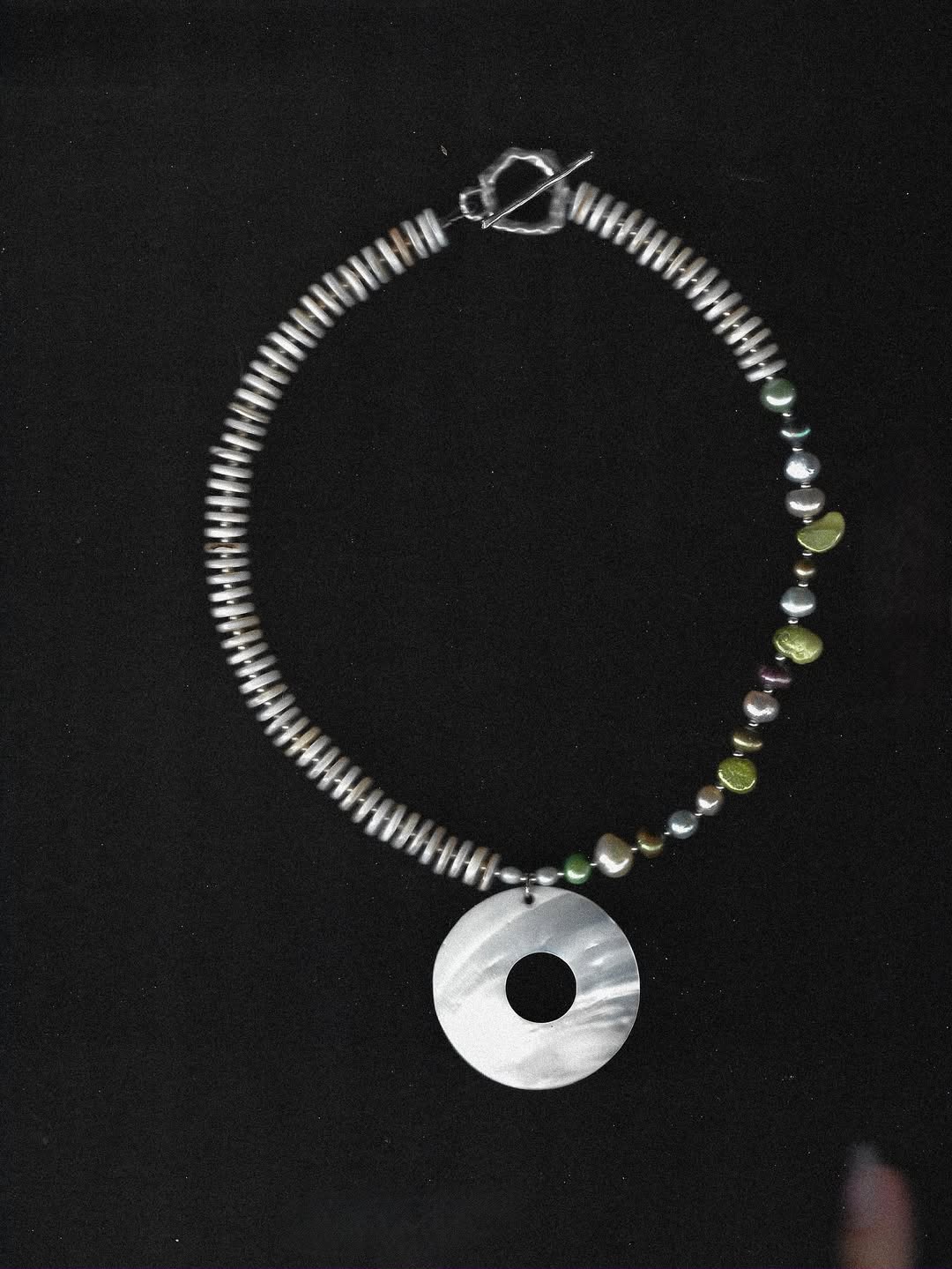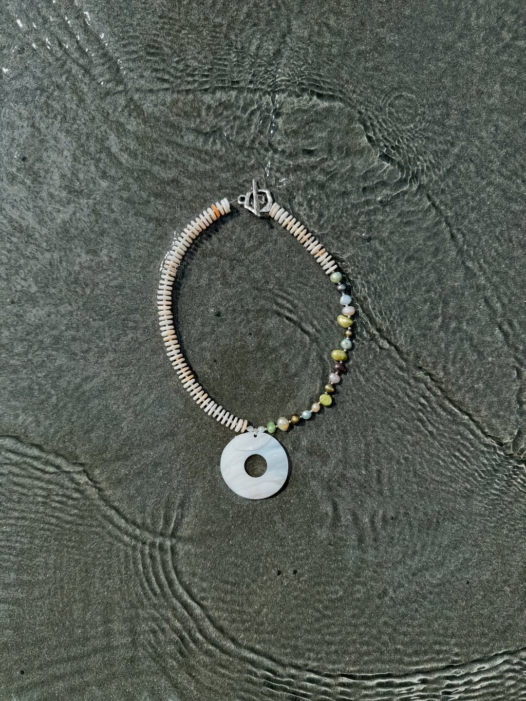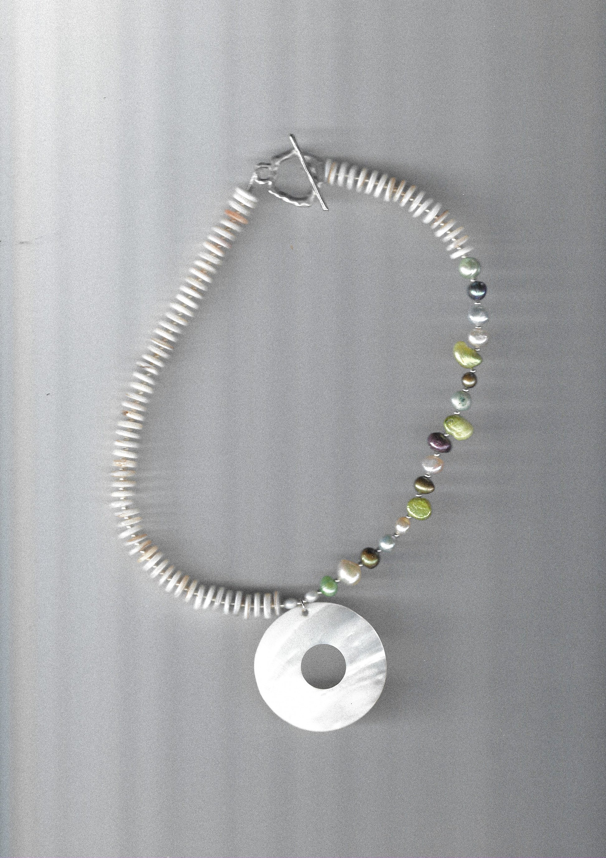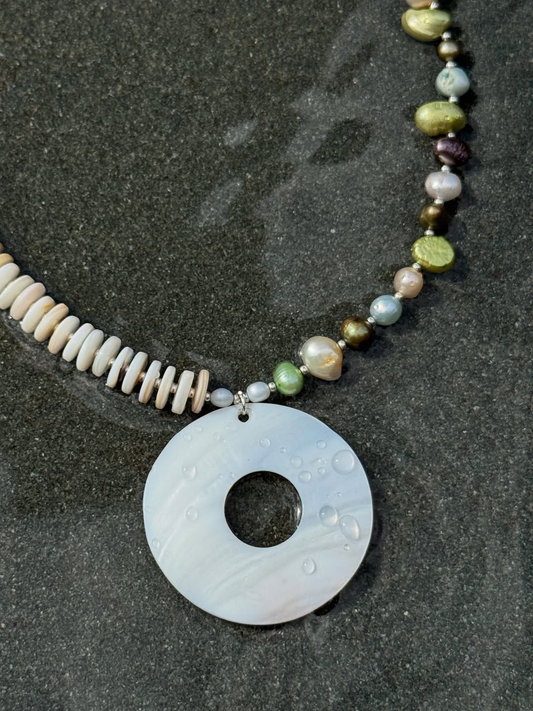 - Freshwater pearl and rondel shell necklace with a donut-shaped Mother of Pearl pendant