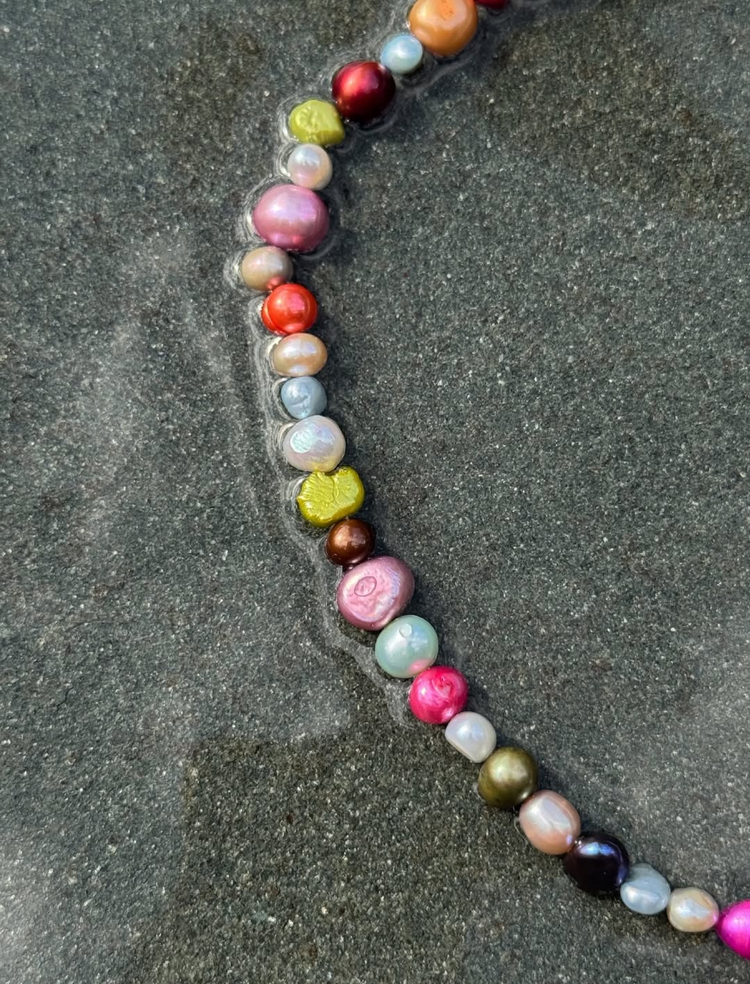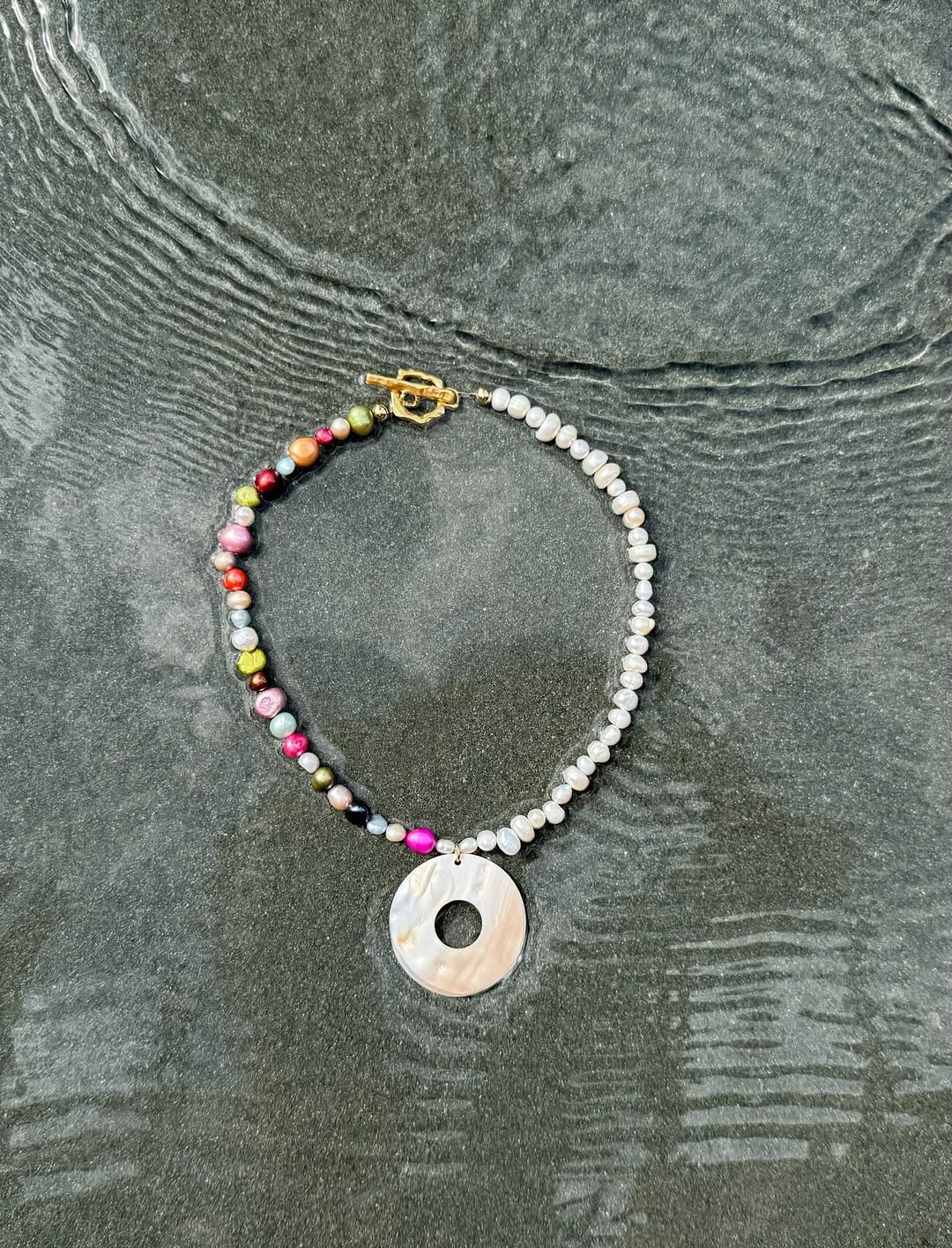 - Multi-colored freshwater pearl necklace with a donut-shaped Mother of Pearl pendant