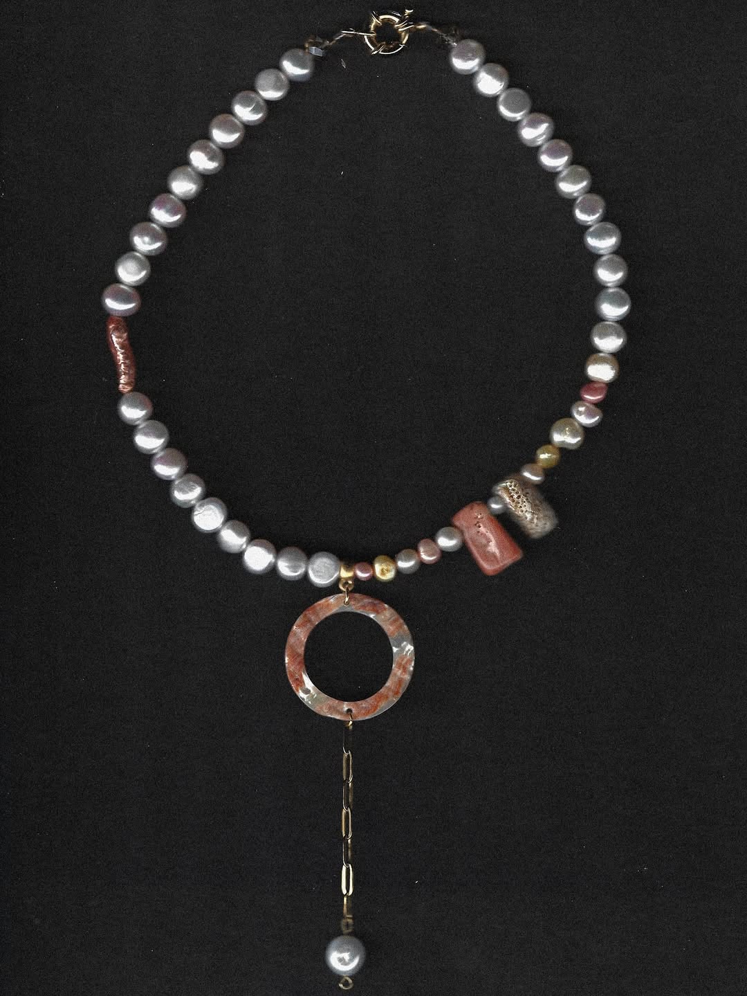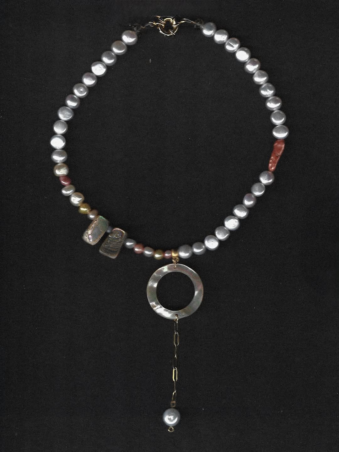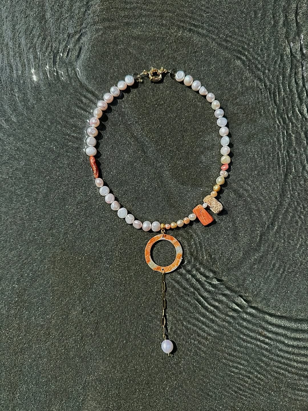 Freshwater pearl and coral necklace with a circle pendant and gold chain lariat